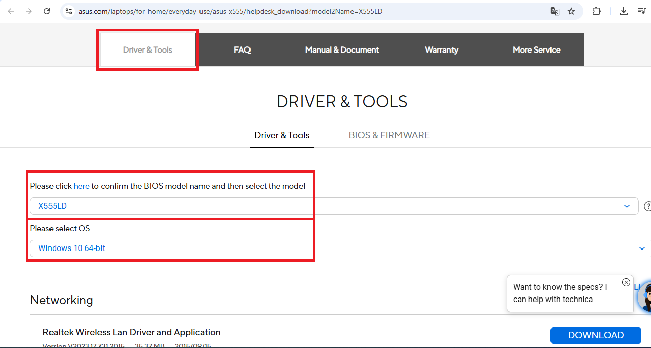 قسمت driver & Tools رو کلیک کرده و در قسمت Please click here to confirm the BIOS model name and then select the model مدل دقیق لپ تاپ ایسوس خود را انتخاب کنید و در قسمت Please select OS ویندوز نصب شده روی لپ تاپ خود را انتخاب کنید و در ادامه هر کدام از درایورها را که نیاز دارید می توانید دانلود کنید.